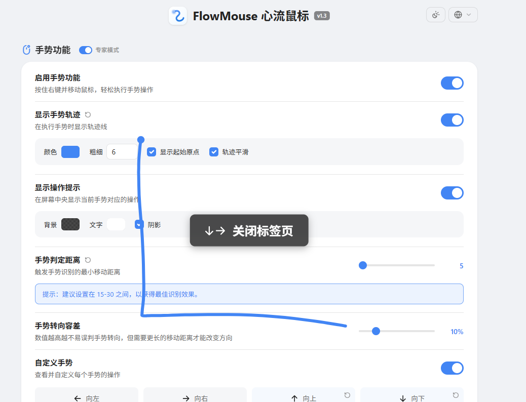 专家模式:支持调节手势转向容差设置