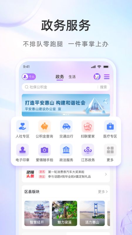 灵锡app一般又称灵锡一点通、无锡灵锡app,是无锡市大数据管理局推出的一款以“互联网+政务服务+公共服务”为主的无锡综合城市服务软件。为市民提供医疗健康、交通出行、文化旅游、数字身份、活动福利以及城市生活等服务入口,涵盖了公安、交通、医疗、教育、社保、公积金等多个行业和领域,能够有效提高了无锡市民的办事效率,使市民能够足不出户实现“指间办事”!