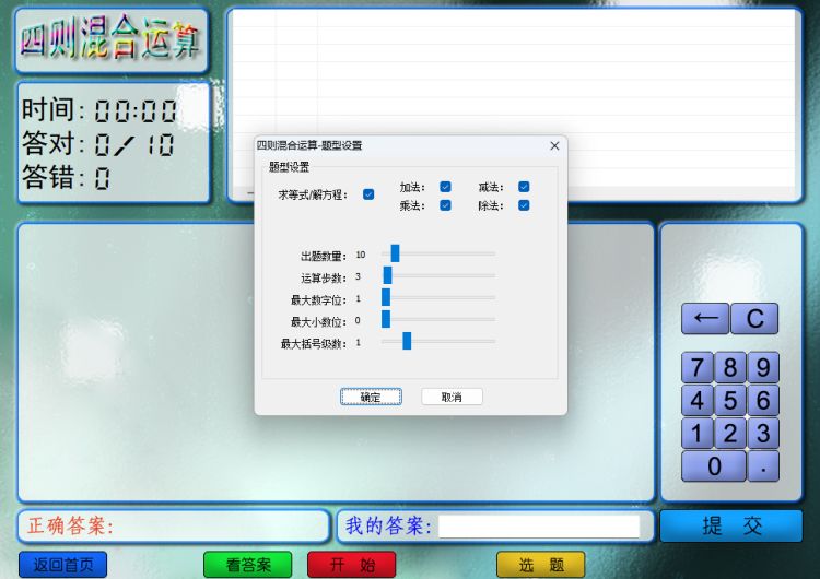 四则混合运算:可以进行加减乘除四则混合运算练习,可设定运算的种类、运算步数、数字位数、括号等级、出题数量、可兼容小数。电脑自动出题,自动判断对错,自动评分。