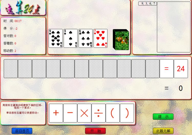 速算24点:非常经典的数字游戏。1副纸牌,每次从中随机抽取4张牌,使用牌的点数、加、减、乘、除和括号,组成1个算式,使计算结果等于24就算成功。