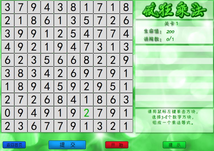 疯狂乘法:本软件独创数学游戏,锻炼你的乘法口算能力。游戏目标:消除所有绿色数字方块。消除规则:选择3-8个数字方块,如果它们满足两个条件,这些方块就会被消除。1、它们可以组成一个乘法等式;2、每个方块必须和其它方块相邻。通过这个游戏,你的乘法口诀一定会滚瓜烂熟的。