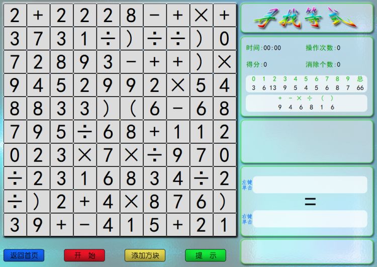 寻找等式:本软件独创数学游戏。随机出现10×10的方块阵列,每个方块上显示一个阿拉伯数字、加、减、乘、除或括号,用鼠标左、右键分别点击这些方块,组成两组算式,如果它们的计算结果相等,那么所选方块就会消失。不断消除这些方块,直到所有的数字方块被消除,背景会显露出一幅漂亮的图片,恭喜您,成功了。