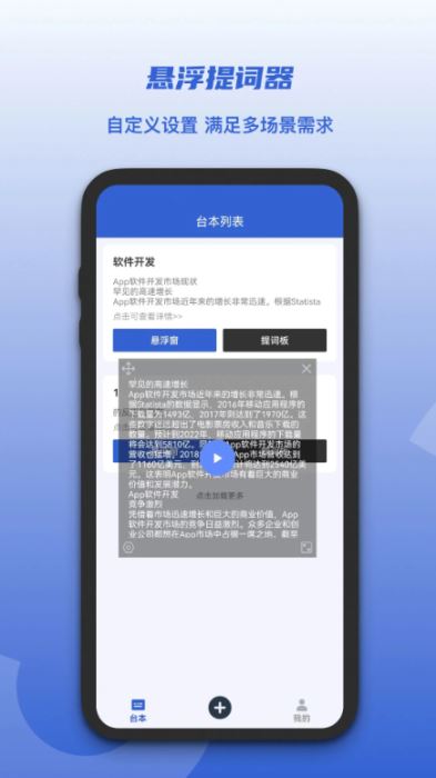 口播提词器手机端使用的提词器软件,这款软件集成了悬浮窗提词、视频拍摄提词器和专业提词器功能,界面简洁,易于上手,欢迎下载使用。