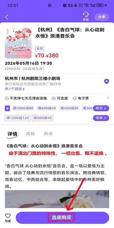 2、来到演出详情页面,再点击页面下方的“选座购买”按钮;