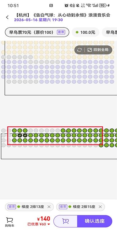 4、在下方绿色按钮勾选自己想要的座位,点击“确认选座”。