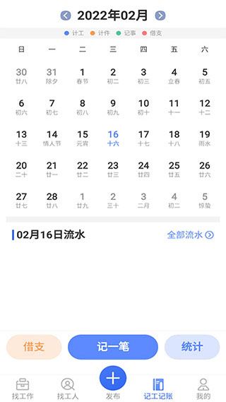 4、【记工记账】页面的主要功能就是通过日历的形式为用户展现出工作情况,用户的每一天的工作内容都可以记录在此。