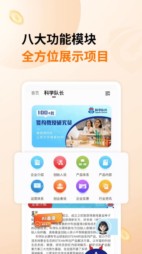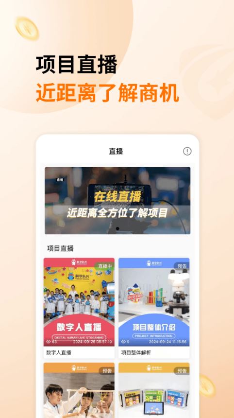 通过直播形式讲解项目,创业者更直观更快速地发现商机!还可以通过直播进行课程培训,让创业者学习生意经。