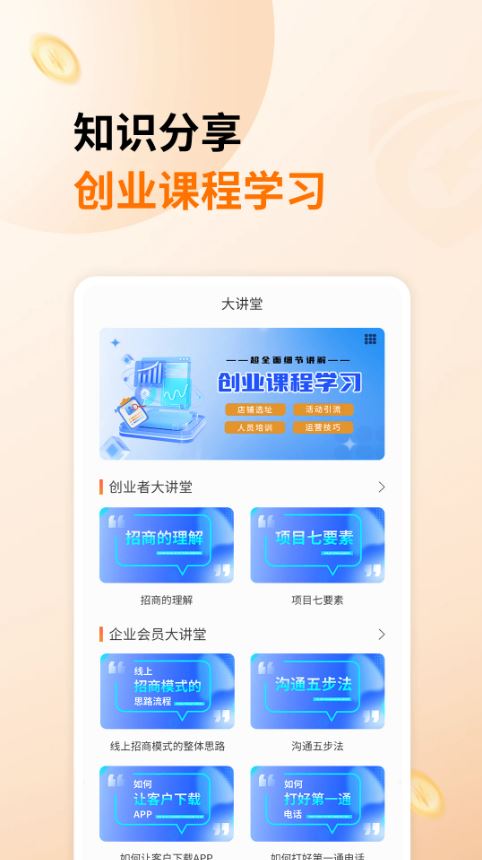 4、用户可以在这里接受课程培训,可以学习更多的生意经,同时还可以结交到更多成功的人士。