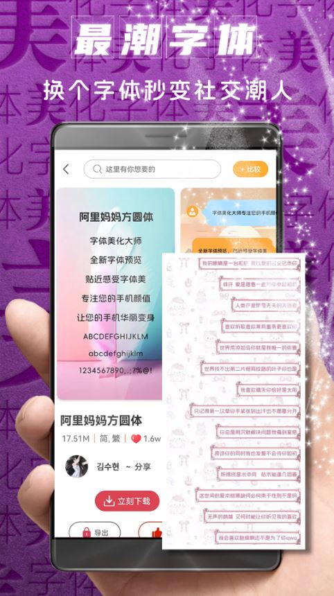 字体美化大师app是一款手机字体管理软件,为用户提供了海量的优质字体资源供其免费下载,让用户的手机看上去更加独一无二。软件可以定制专属字体,让自己的手机更符合自己的风格,满足用户的各种手机字体管理功能需求。字体美化大师致力于提供便捷且多样化的字体管理服务,这款应用不仅涵盖了市场上几乎所有手机型号,而且还采用了高效的云服务器技术来快速下载字体资源。感兴趣的朋友快来下载使用吧!
