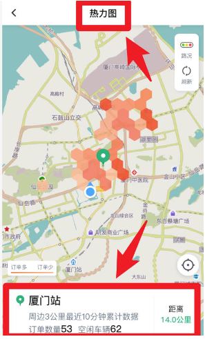 4、热力图功能可展示周边地区的订单需求情况,司机可以根据订单数量与空闲车辆数量选择合适的区域,提高接单效率。