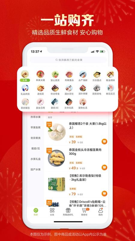 水果、蔬菜、肉禽蛋、海鲜水产、熟食面点、粮油调味、乳品烘培、休闲零食、酒水茶饮、滋补保健、厨房家电、家纺箱包、鲜花、美妆、数码3C、文体玩具、宠物生活等,一站式备齐所有食材,在家就能享星级大餐。