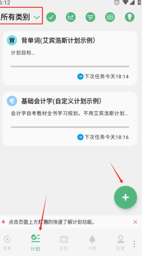 3、进入计划页面,点击所有类别就能查看自己制定的不同计划,点击“+”可以创建新的计划;