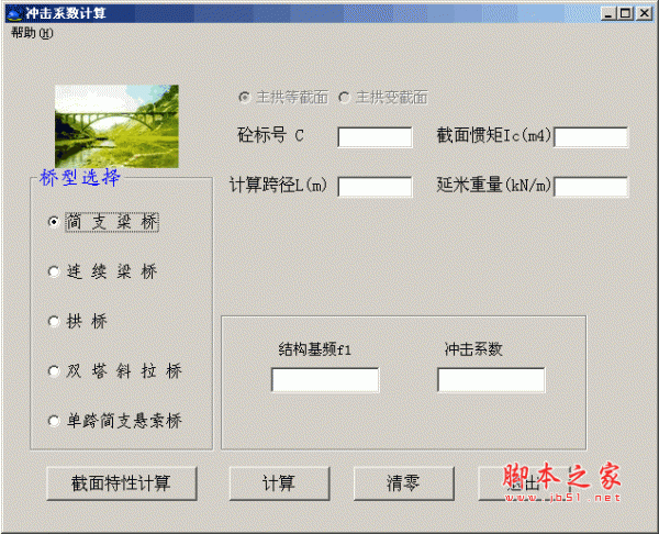 桥梁冲击系数计算(新规范) v2.0 中文绿色版 大小:36KB 分类:工程建筑 环境:Windows 更新:2013-05-28 下载 热门排行 JOJO奇幻冒险 蜡笔小新 咒语旅团 越狱模拟器 最后生还者 架空地图 交易猫 乐高大乱斗 小偷模拟器 石河伦吾的朋友们 道友请留步 欢乐小镇 简介 桥梁冲击系数计算是一款基于《桥涵设计通用规范》(JTG D60-2004)4.3.2而设计的辅助计算软件,纯绿色版,即下即用,能够对简支梁桥、连续梁桥、拱桥、双塔斜拉桥、单跨简支悬索桥等五种桥型进行冲击系数计算。同时软件版本还包括惯矩及截面面积计算功能,并根据后者得到延米重量,在进行冲击系数计算时各系数可以直接输入也可利用此功能计算得到,是一款非常实用的桥梁冲击系数计算软件,适用于工程建筑人员使用。