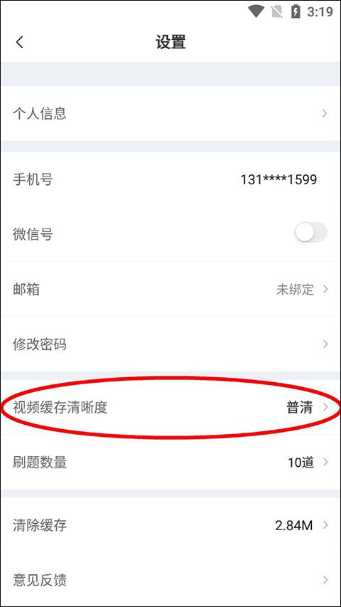进入设置界面可以看见很多对我们使用这款软件都很有帮助的功能,例如修改密码、个人信息、设置刷题数量等功能,这个时候我们就点击刷题数量上面的视频缓存清晰度。