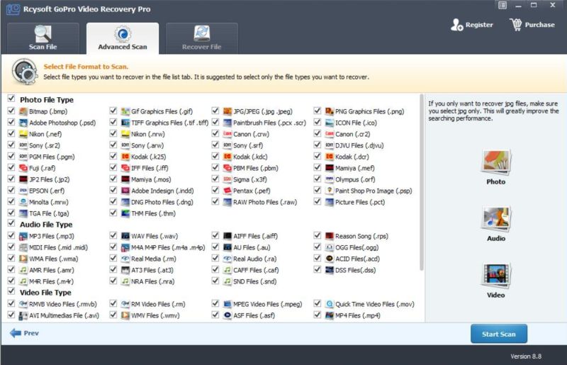 恢复GoPro摄像机和GoPro便携式摄像机记录的所有文件类型,包括视频,照片和音频文件。
