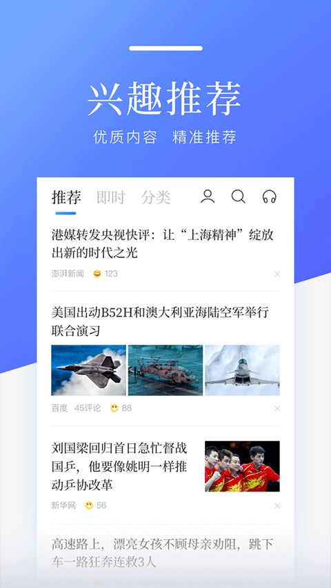 用户还能够根据自己的兴趣选择内容类别,打造自己专属的阅读空间。并且还拥有即时推动功能,能够即刻获取实时新闻进行推荐,让用户了解现下热门事件。更有精准“个性化推荐”技术,用得越多,百度新闻越懂你!