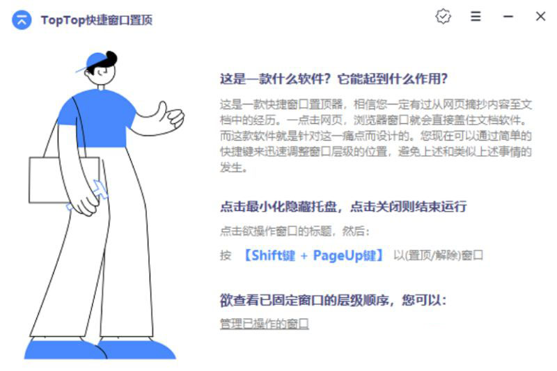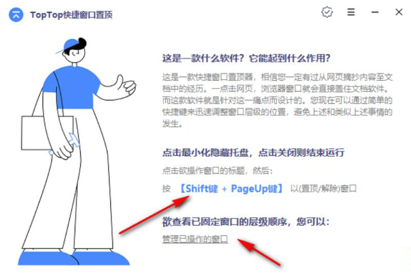 1、打开TopTop快捷窗口置顶软件,阅读界面的内容,在软件查看置顶快捷键