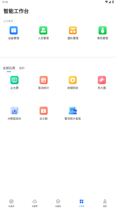 360视觉云App是一款全栈式的物联网云服务平台,主要服务于(中小)企业,为其提供了企业管理、人员管理、部门管理、视频监控、云存管理、角色管理等6个基础管理应用。