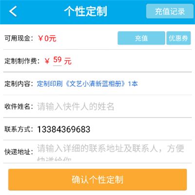 7、输入收件姓名、以及地址,点击【确认定制】付款即可。