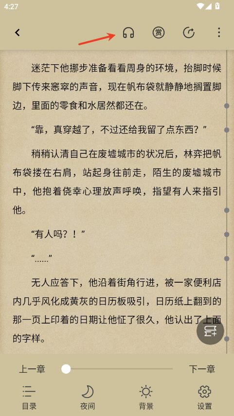 1、在小说阅读界面点击屏幕唤起功能菜单。