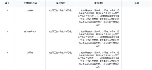 “老花镜”、“光学镜架/镜片”、“太阳镜”类商品,您还需上传下列行业资质: