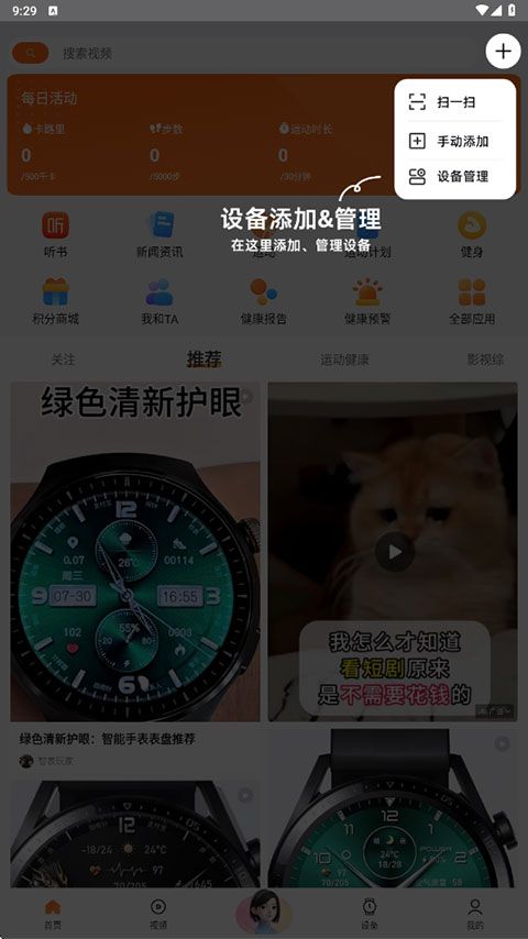 3、点击设备,用户可以自定义添加设备,同时还有天气推送、消息、闹钟、健康提醒等等设置。