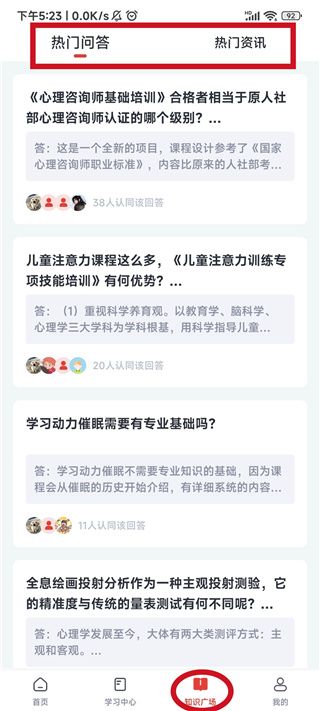 6、选择底部的“知识广场”板块,这里有全平台最热门的问题和新闻资讯;
