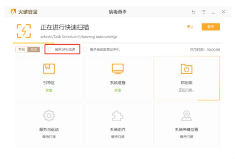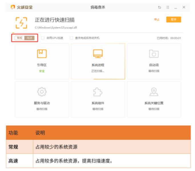 火绒为您提供了[常规] 速度查杀和[高速] 查杀(见下图) 两种模式供您选择。