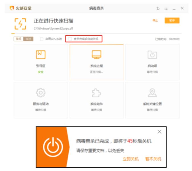 勾选即启用功能。勾选后火绒将自动处理病毒扫描完成后发现的威胁,在威胁处理完成时弹出关机提示 (见下图),关机提示等待的时间为 45 秒,45 秒后将为您自动关闭电脑。您仍在此期间可点击“暂不关机”或“X”以取消自动关机。