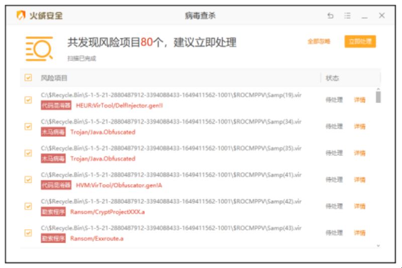 当扫描到威胁后,火绒安全软件提供病毒处理方式的选择。