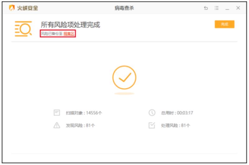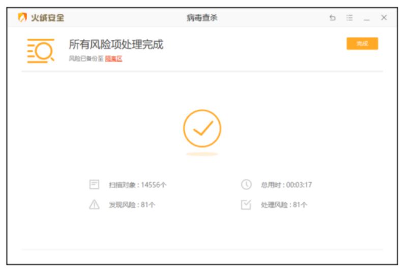 将威胁文件处理完毕后,提示扫描完成 (下图),为您展示扫描概况,在上一步处理的威胁添加至[隔离区]。