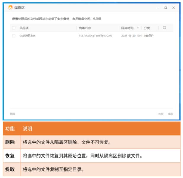 火绒会将扫描后清除的风险项文件,经过加密后备份至[隔离区](见下图),以便您有特殊需要时,可以主动从隔离区中重新找回被清除的风险项文件。