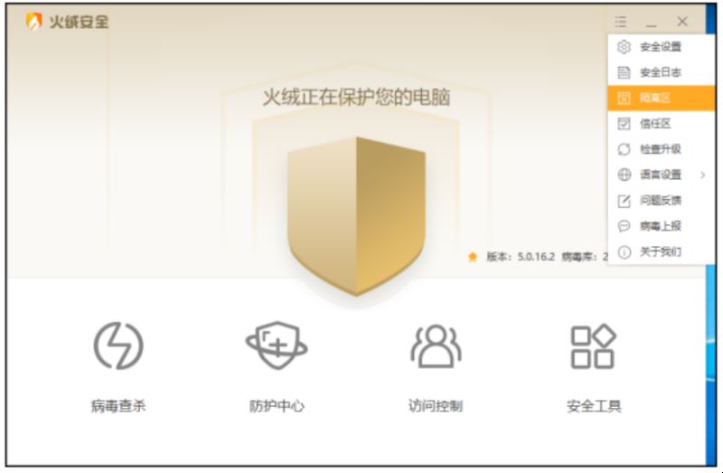 在鼠标右键单击火绒托盘图标后显示的快捷菜单中也可以找到隔离区 (见下图)。
