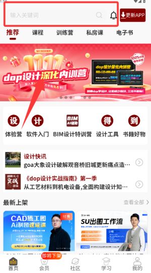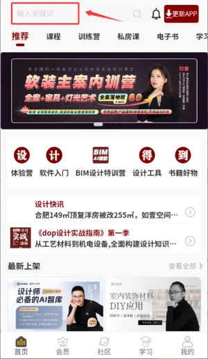 2、首页搜索栏可输入关键词查找家装设计课程。