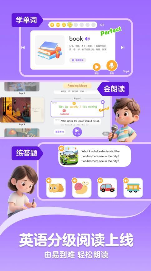 将绘本开发为有声绘本,实现好听又好看的阅读体验,支持自动翻页和家长手动翻页。