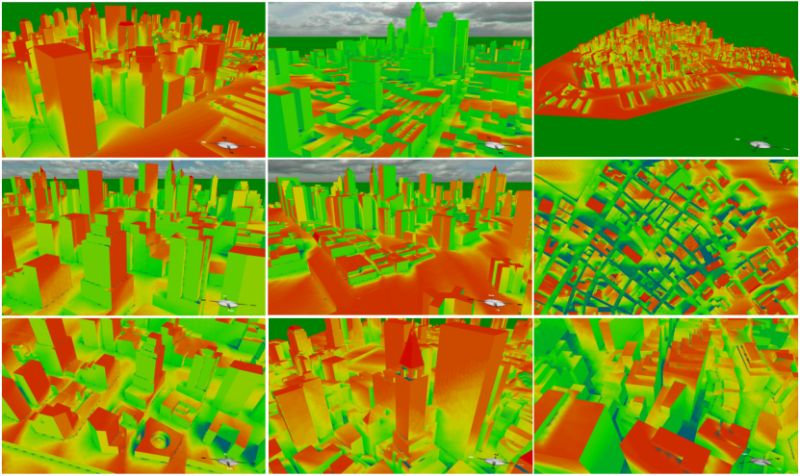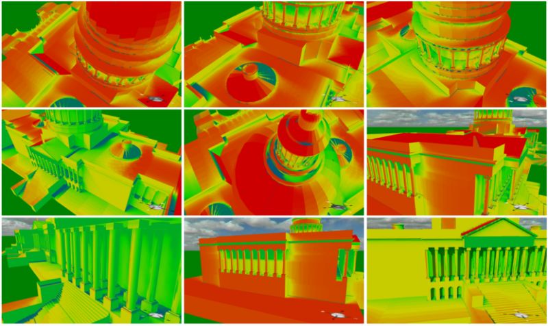 太阳辐照度热图可直观展示表面每日的太阳辐射分布, 这可能有助于自然采光和太阳能潜力分析。 下方示例展示了纽约市曼哈顿下城和华盛顿特区美国国会大厦的分析结果。