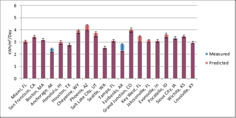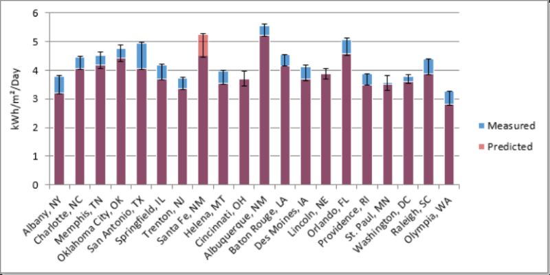 在美国150个地点的平均值中,Energy3D预测的水平表面日平均太阳辐射量与测量结果的偏差±14%以内,而朝南垂直表面的偏差在±10%以内。以下图片展示了美国20个城市计算数据与测量数据的对比。 测量数据来自美国能源部收集的国家太阳辐射数据库。水平表面的太阳辐射量(月度分解):