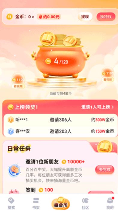 3、app还可以边看小说边赚取金币的