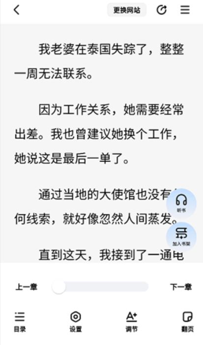 4、浏览小说时可以进行目录切换、开启听书模式、字体设置等常规操作