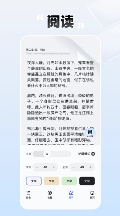 提供6种护眼背景色(如夜览黑、纸质黄)、12款字体及字号调节,支持横屏/竖屏自由切换。