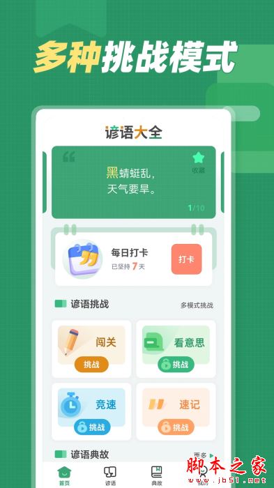 3.谚语大全每天会给用户推荐几条精选谚语,并设置了收藏功能;每日打卡可以让用户养成每天学谚语的习惯;谚语挑战是通过趣味的玩法更好的学习掌握谚语;还包含了谚语故事,带你了解谚语背后的故事。