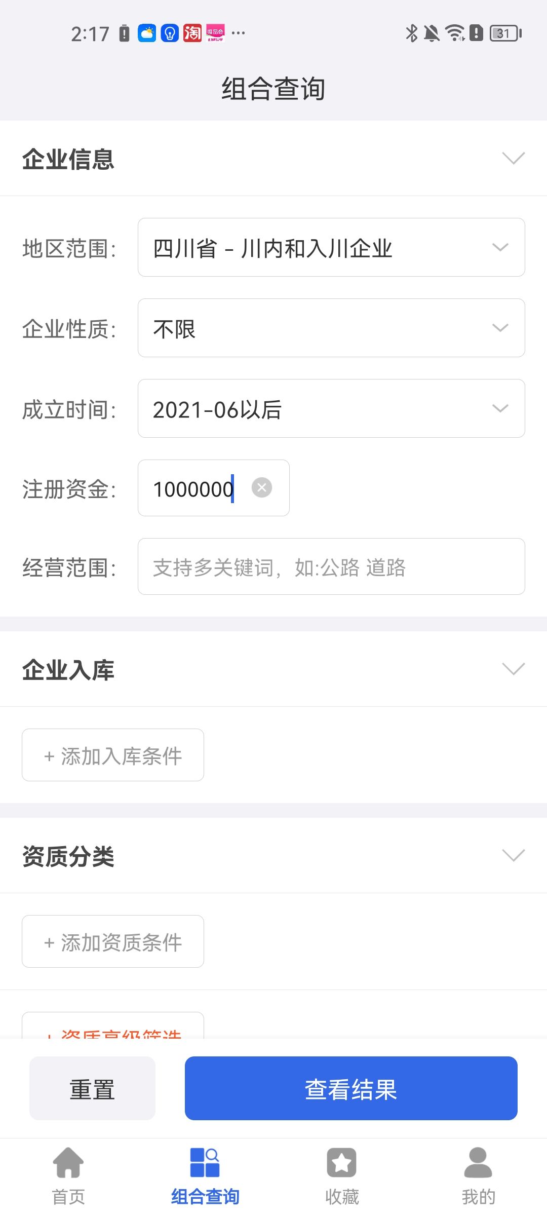 2、(1)组合查询功能界面中【企业信息】选项输入(四川省、川内和入川企业、注册资本金:1000万);
