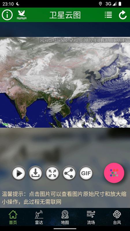 2、图片不保存在本地,不必担心硬盘空间实时获取当前及之前中国及周边上空的云图。