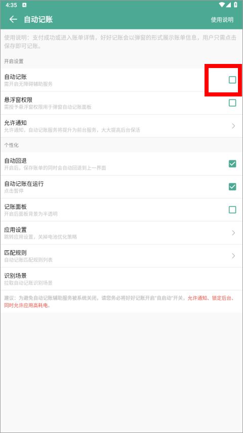 5、最为人性化的是,你可以设置自动记账功能,当之处成功或进入账单详情之外,软件会以弹窗的形式记录账号。