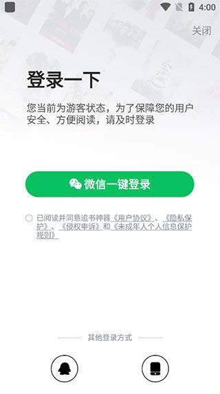 1、首先打开追书神器最新版,支持微信一件登录,不过也可以使用QQ或手机号进行登录;