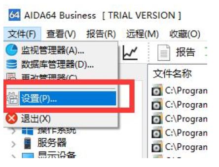 1、在本站下载并安装aida64 business,打开软件,点击菜单栏的文件-设置。