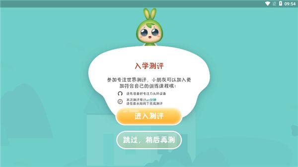 3、进入软件后用户可以进行入学测评,测试孩子的专注力和专注状态。