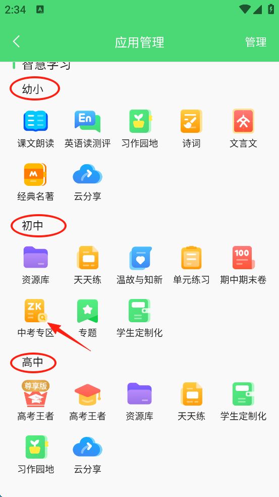 3、可以看到“幼小”、“初中”、“高中”三个部分,用户可以根据需求选择,初中为例,点击“中考专区”。