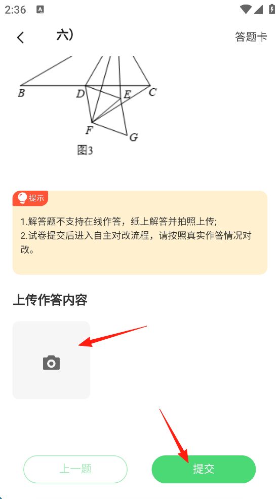 7、解答题目后,可以拍照上传作答内容,最后点击屏幕右下角的“提交”。