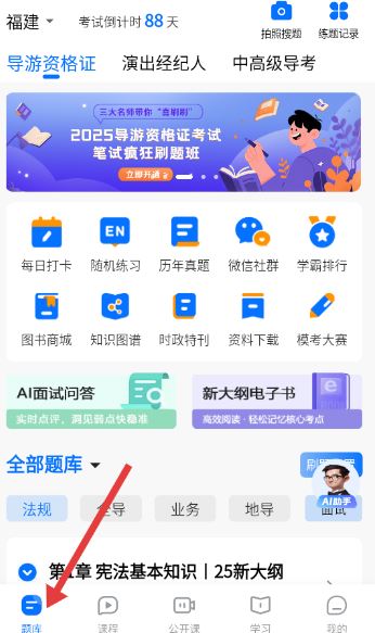 1、题库首页定位福建导游资格证考试倒计时88天,集成每日打卡、历年真题等多样功能,醒目推荐2025笔试刷题班。